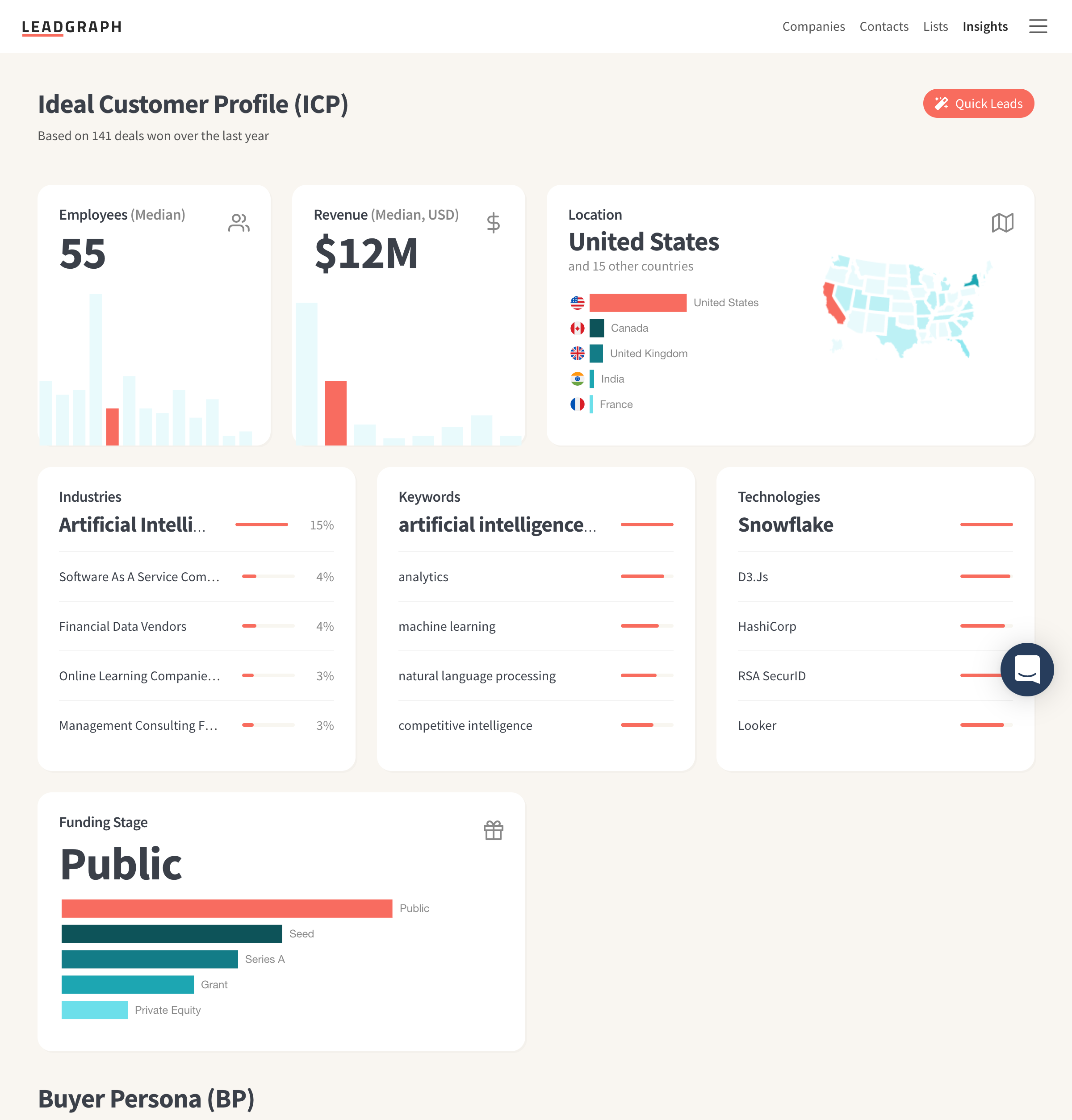 Search by any keyword, technographics, funding, or let Quick Leads take the wheel.