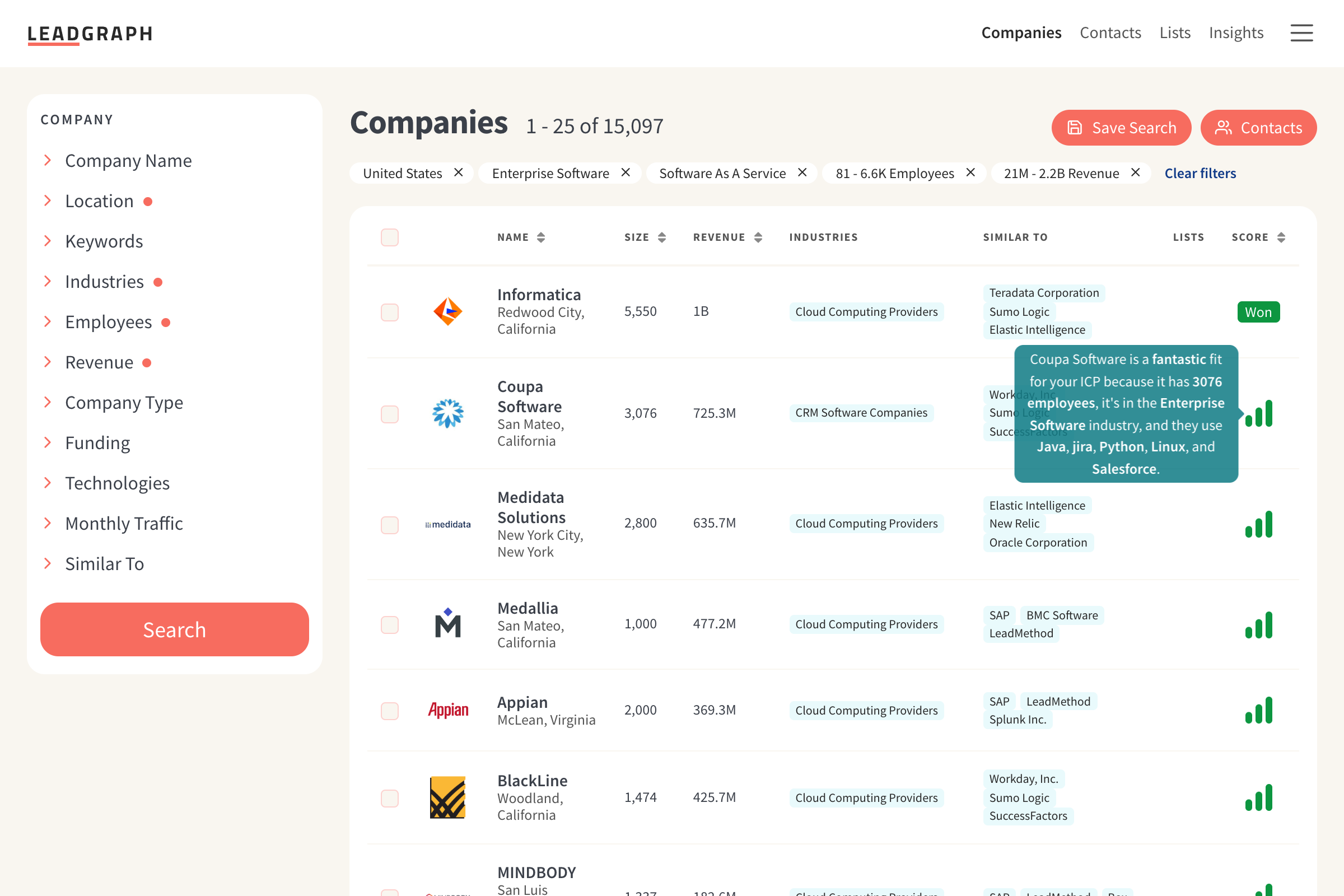 advanced filters and precise ICP match scoring.